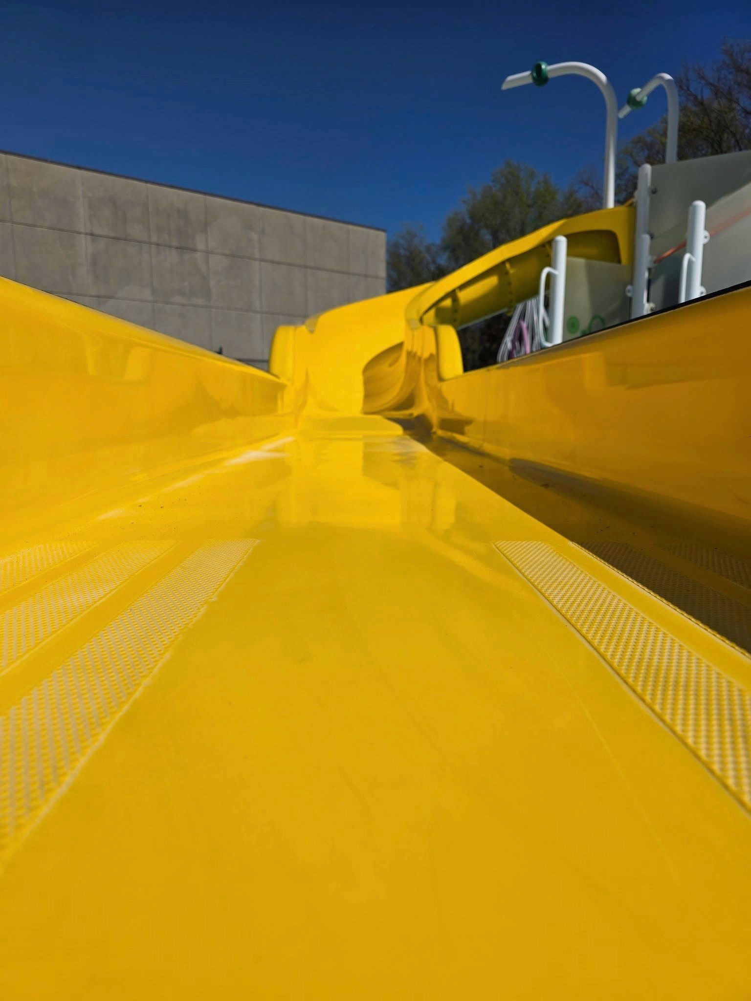 The coating applied to the exterior is marine-grade material, engineered to withstand constant water exposure, direct UV, and saltwater environments. If these materials can hold up on vessels sitting in the ocean and baking in the sun every day, they can more than handle a waterslide. This is why our exterior finishes last over a decade and still hold their shine. We currently have slides coated over ten years ago that look like they were finished yesterday.