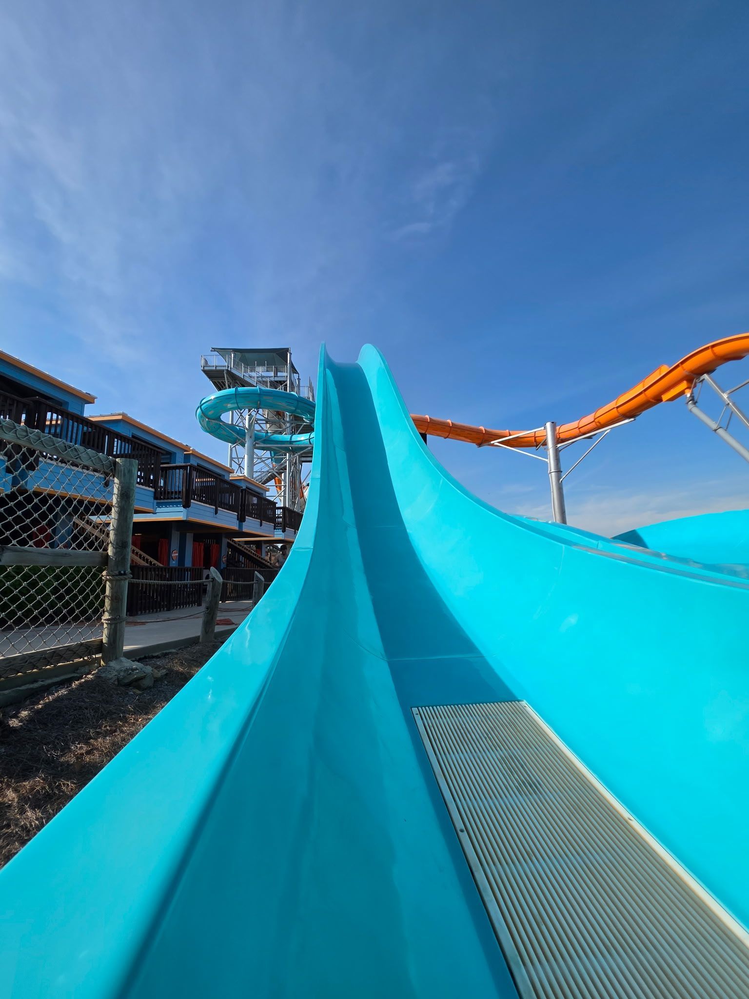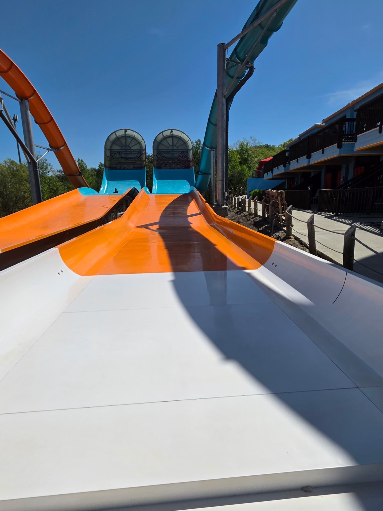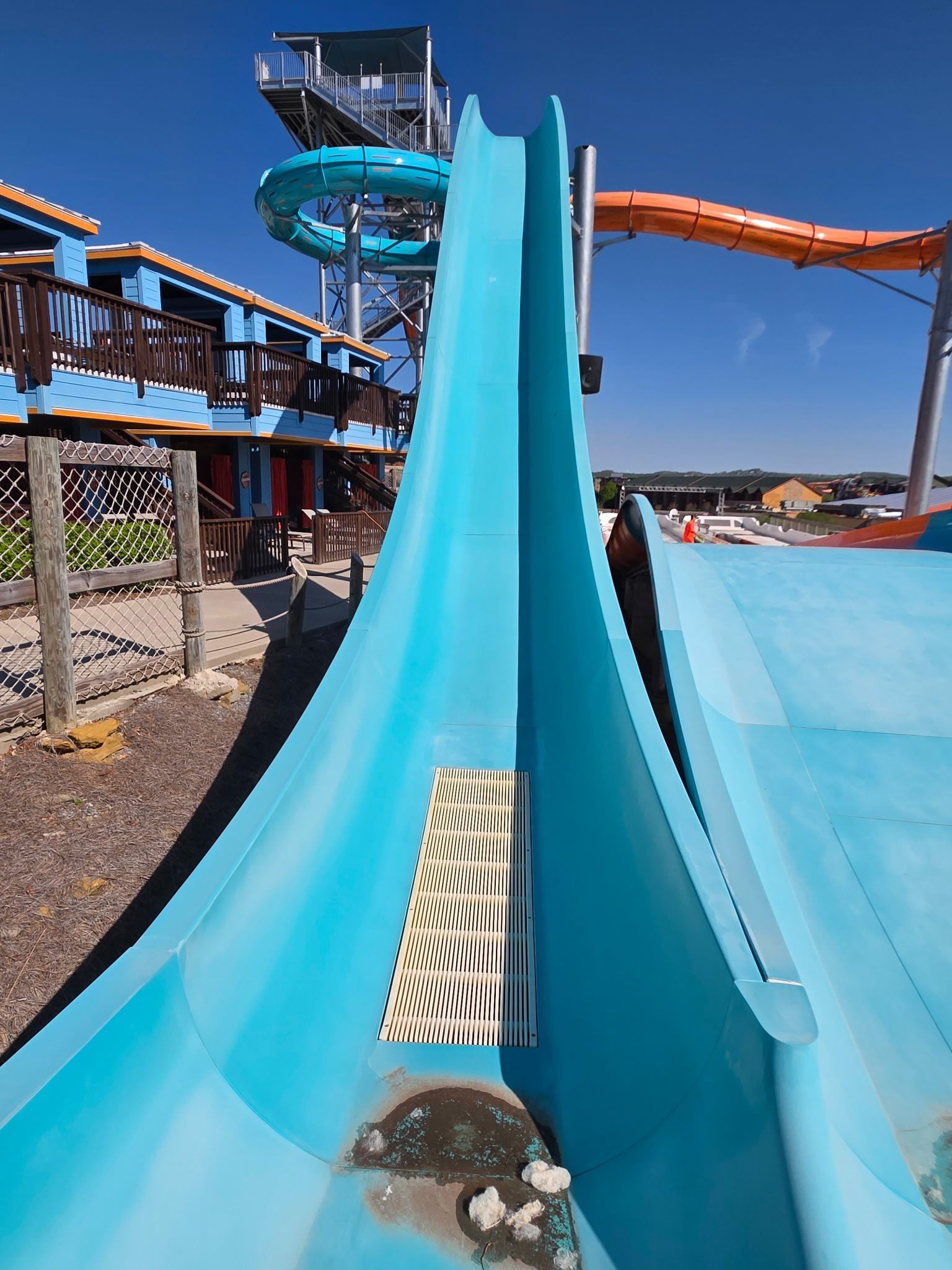 The slide was restored to like-new condition — as vibrant and glossy as the day it was first installed. The park saved significant cost by avoiding an unnecessary full respray, and the surface finish exceeded their expectations.